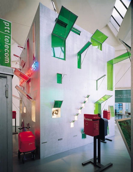 ’Signs in the street’ the Dutch contribution to the 1992 Trienal of Milano. It centers on street furniture designed for The Dutch PTT over the past 80 years. The Dutch PTT has a long history in excellent design practice, a practice that stretches from mail stamps and other printed matter, architecture, monumental art to street furniture. Within the masterplan - devised by Aldo Rossi - a ’crossing’ is designed with theatrical means, an ’old’ street and a ’new’ one. The windows in the ’facades’ offer views of images, models and texts. The proportions of the crossing offer a meaning and size relevance to the objects. The backside emphasizes the illusion of all exhibitions, including this one.